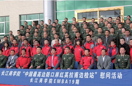 圖為長(zhǎng)江商學(xué)院第十九期EMBA班學(xué)員與紅其拉甫邊檢站官兵合影(二排右三為陶靈萍董事長(zhǎng))