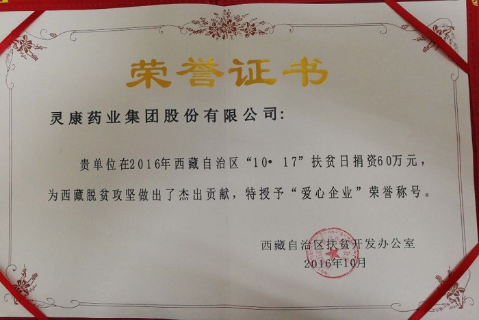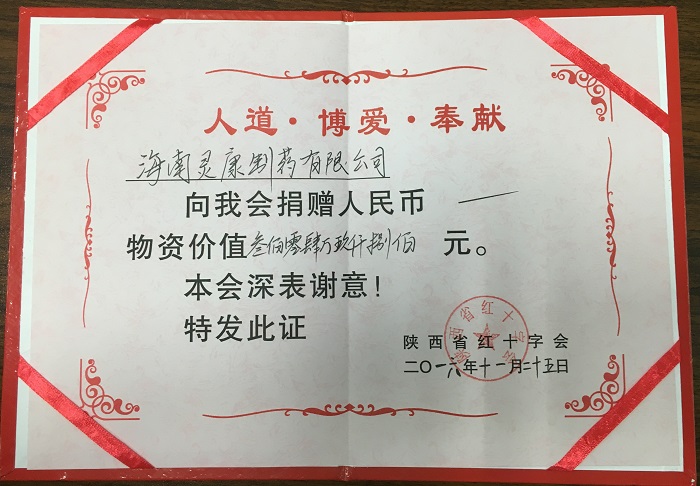 2016年12月2日,海南靈康制藥有限公司向陜西省紅十字會(huì)捐贈(zèng)價(jià)值305萬(wàn)元的藥品,用于陜西省部分地區(qū)貧困家庭疾病患者的免費(fèi)醫(yī)療救助。